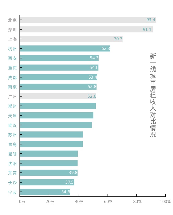在新一线城市中,长沙凭借相对较低的租金,宁波凭借相对较高的收入,房租收入比在35% 左右,即3成左右收入用来租房,可实现租赁自由。