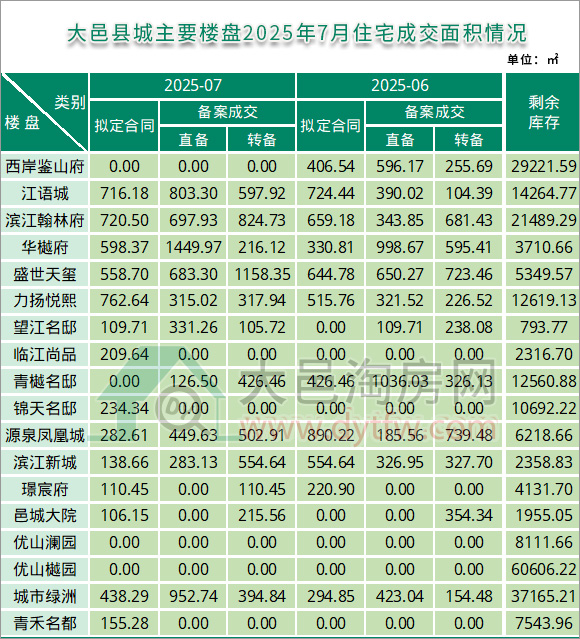 2025年7月大邑县城主要楼盘住宅成交面积情况