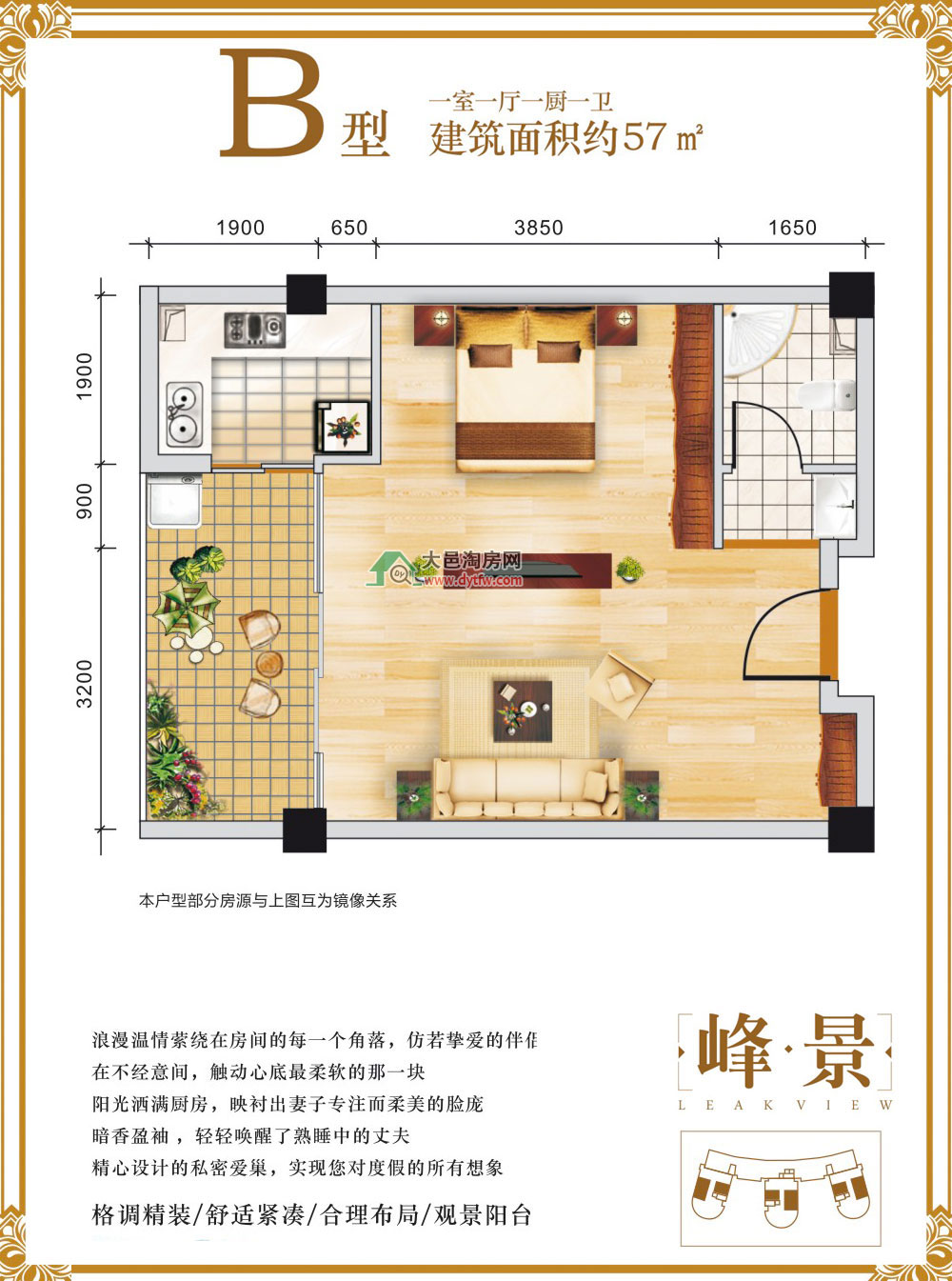 B型1室1厅1厨1卫建筑面积约57m²