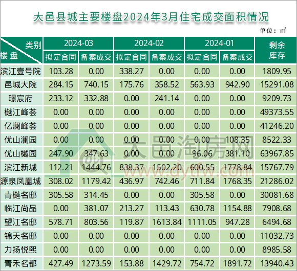 2024年3月大邑县城主要楼盘住宅成交面积情况