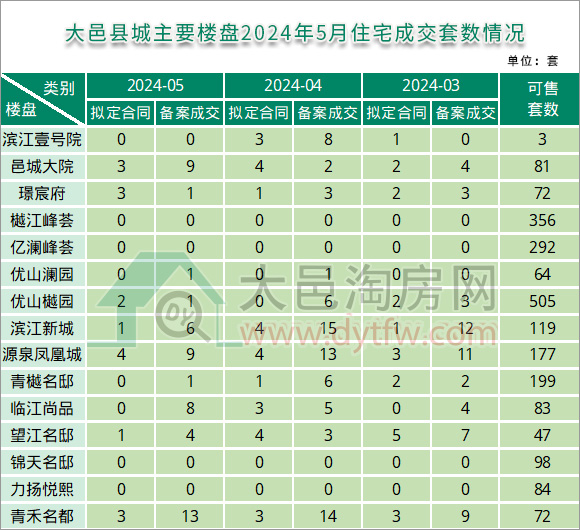 大邑淘房网信息 上一篇文章我们给大家介绍了2024年5月大邑县城主要楼盘住宅成交面积,15个盘共签约备案约6832.05平方米,那么各楼盘本月的具体销售套数是怎样的?