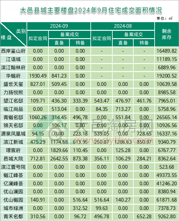2024年9月大邑县城主要楼盘住宅成交面积情况